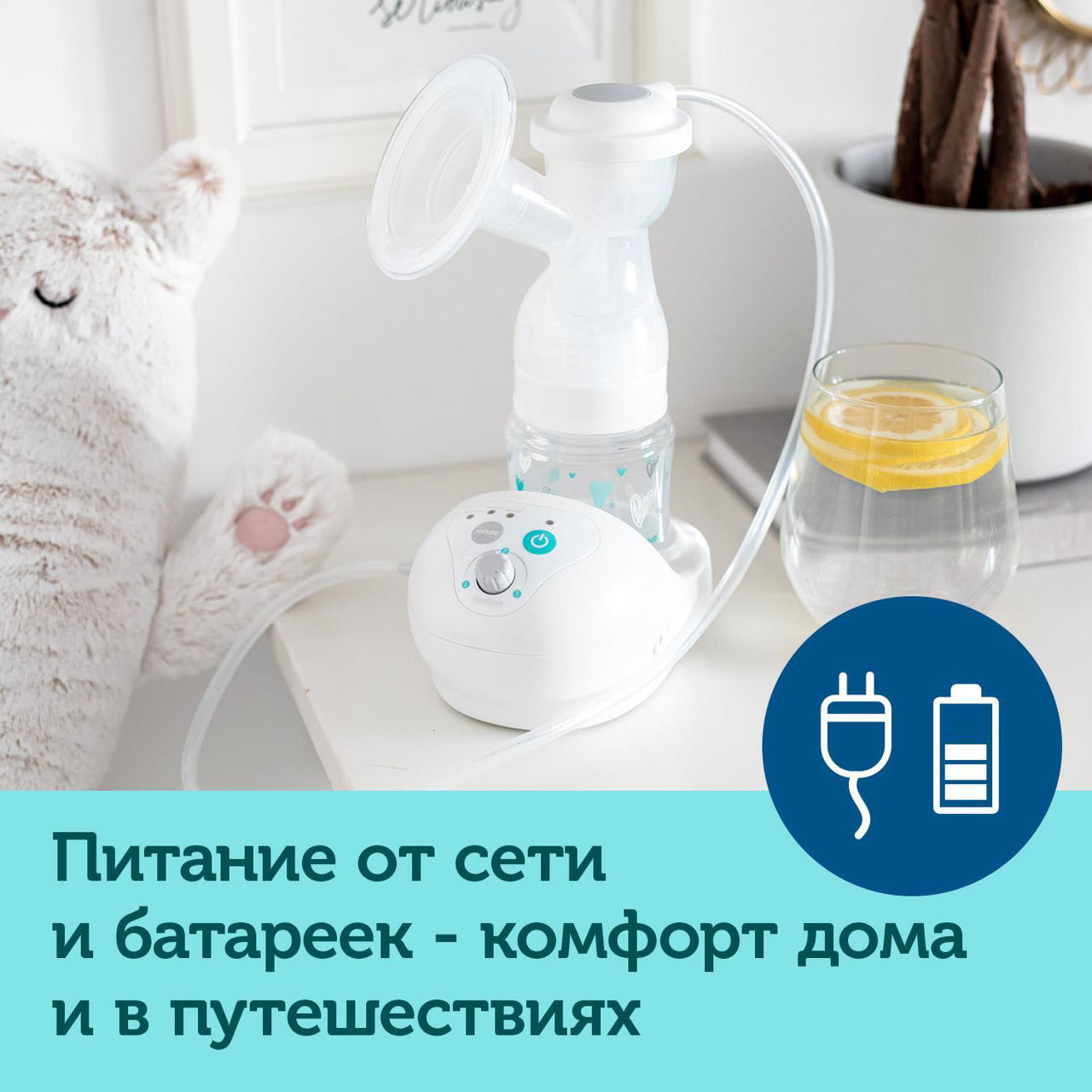 - 2 вида электропитания (аккумулятор и сеть) позволяют использовать молокоотсос дома и в пути.