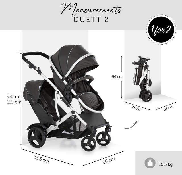 Duett 2 este echipat ideal pentru a călători cu doi copii. Datorită roților din față pivotante și blocabile, căruciorul este foarte manevrabil. Datorită suspensiei concepute pentru doi copii, acest cărucior dublu este potrivit și pentru excursii prin oraș și drumuri de țară.