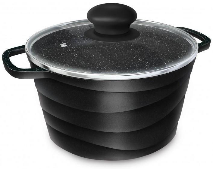 Oala are un corp drept modern din aluminiu turnat cu un desen geometric unic „valuri”.