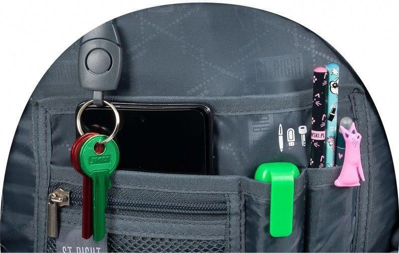 • Primul Compartiment: Este un organizator complet, cu buzunar tip plasă cu fermoar pentru obiectele mici, spații dedicate pentru instrumente de scris, telefon și alte accesorii, și un breloc detașabil pentru chei.