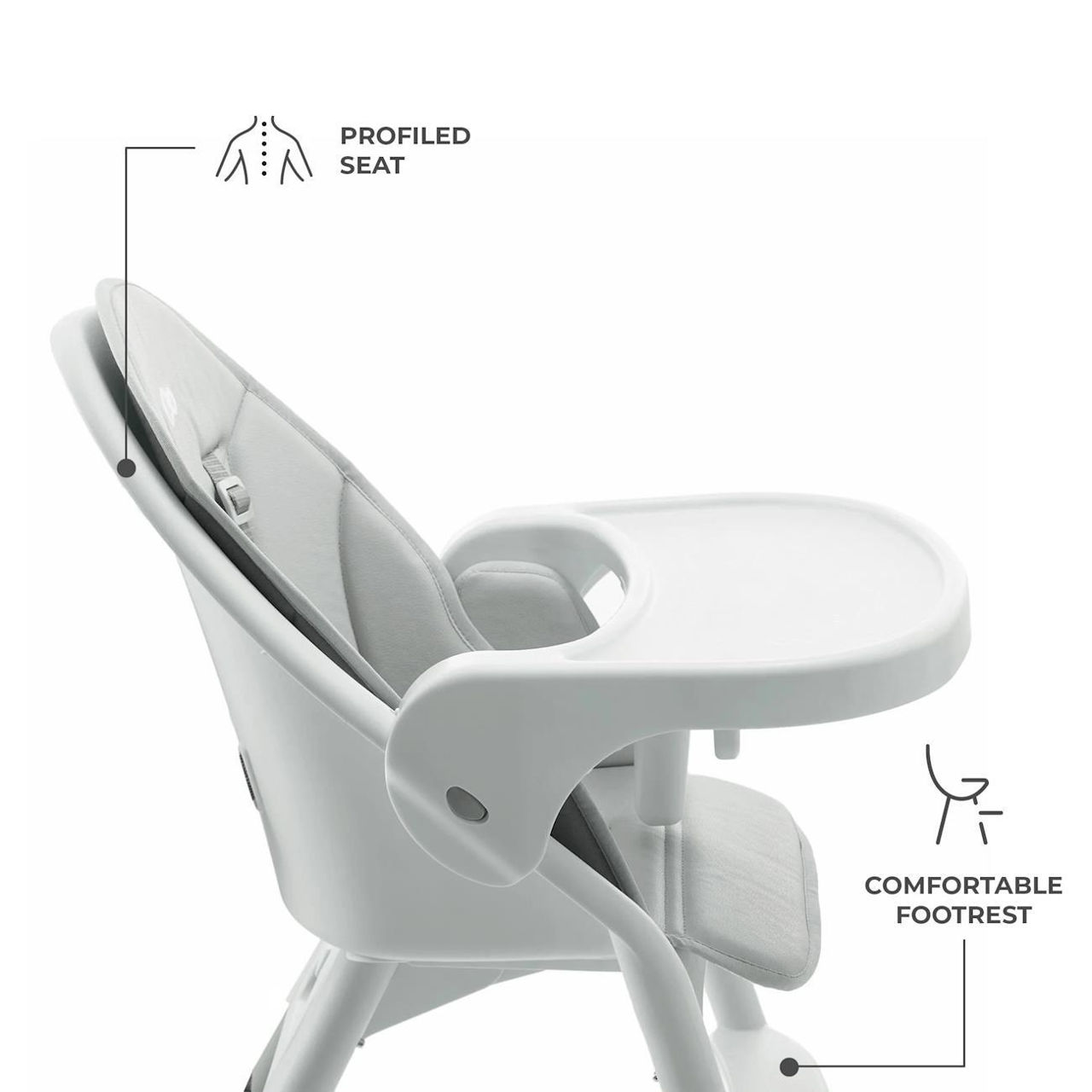 Кресло обеспечивает безопасность благодаря своей устойчивой конструкции и ремням. Поднос выполняет функции ограждения и пластины и изготовлен из сертифицированных материалов, безопасных для детей.
