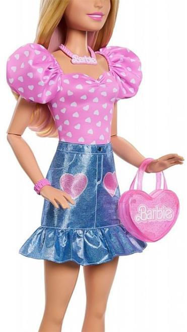 Barbie одета в съемный стильный топ с короткими рукавами-воланами и сердечным принтом, а также джинсовую юбку с шимером. Клевые белые ковбойские сапоги придают стильные акценты образу.