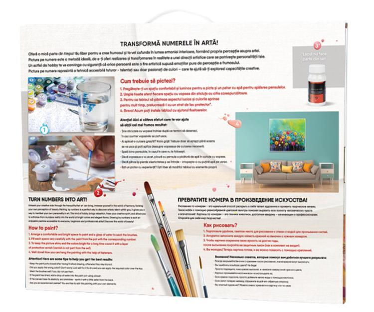 Tip: pictură / Material: pînză de bumbac / Vârsta recomandată: de la 12 ani / Inclus în set: 3 pensule;vopsele acrilice;fixator pentru perete;pânză