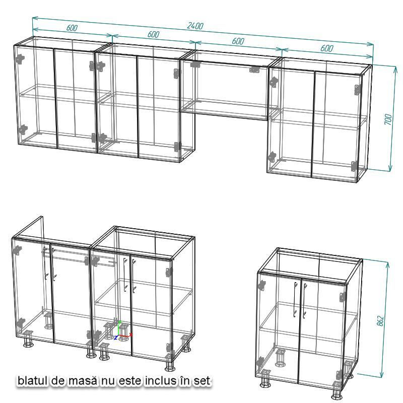 Tip: modulara / Structura: liniar / Componența setului: dulap superior;dulap inferior / Lungimea, mm: 2400