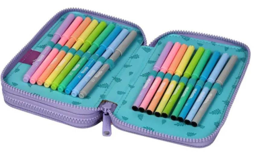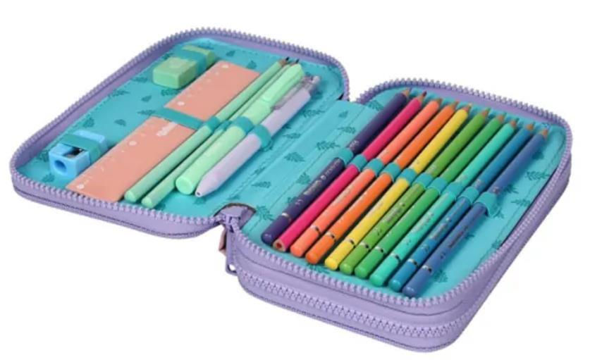 Conținutul penarului include: 12 creioane, un creion, o ascuțitoare, o radieră, 18 markere, o riglă și un pix.