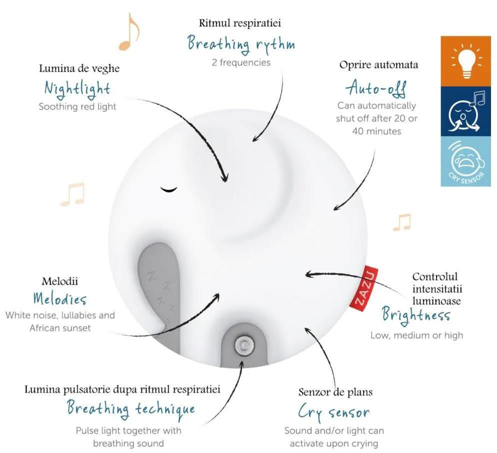 ascultând sunetul respirației și privind cum lumina se micșorează, bebelușul va urma automat ritmul și va adormi.