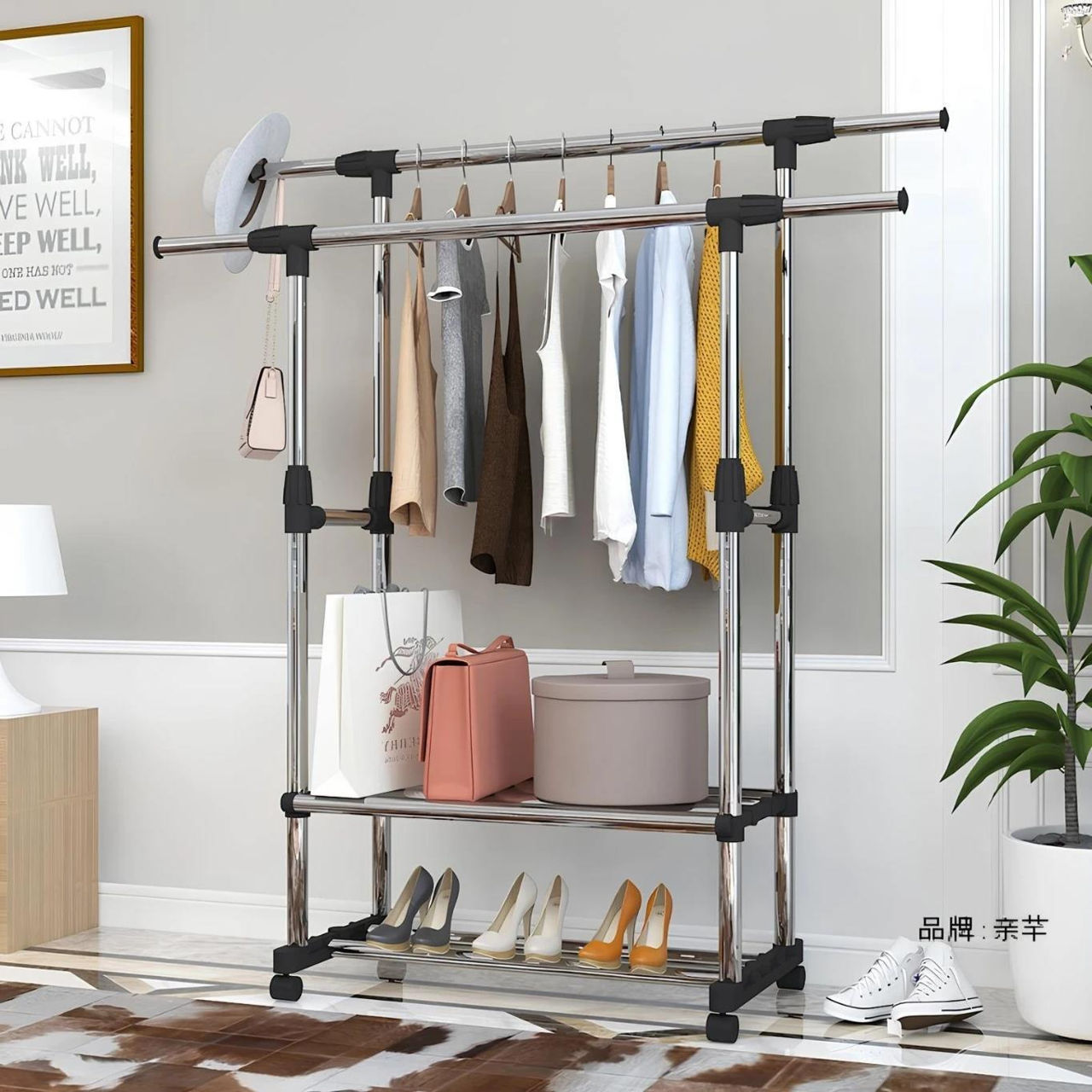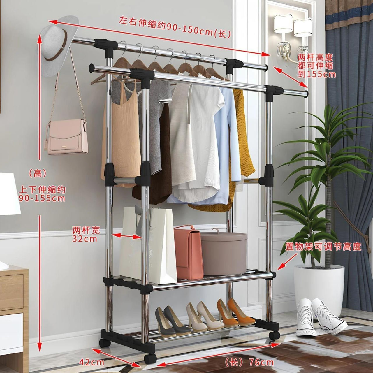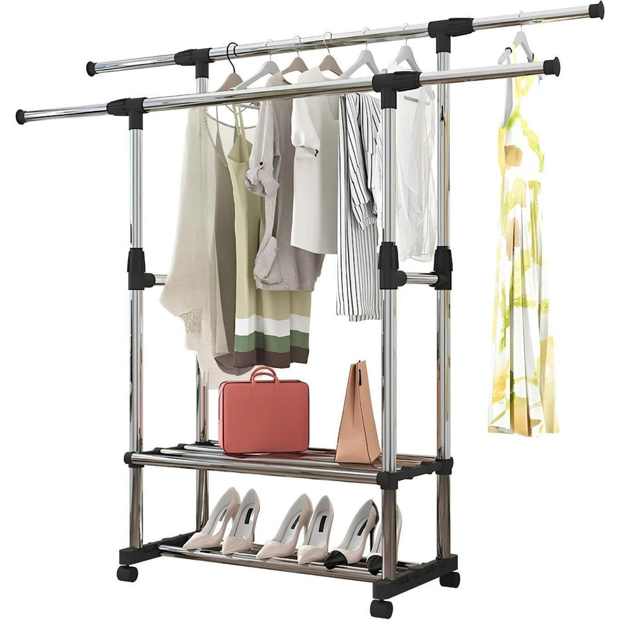 Tip: cuier cu bară / Material carcasă: metal / plastic / Înălţime, mm: 1500 / Culoare: negru / inox