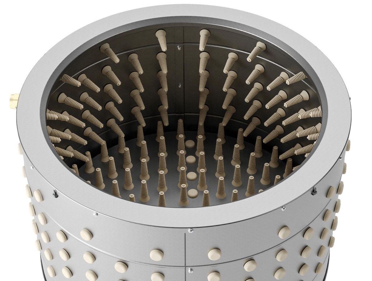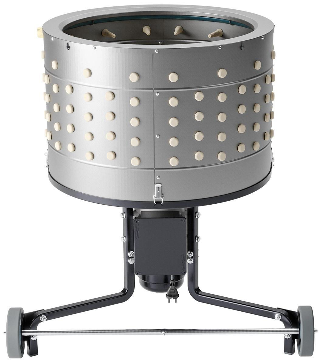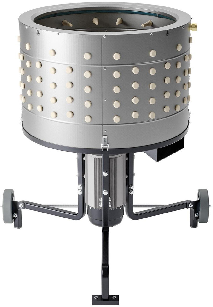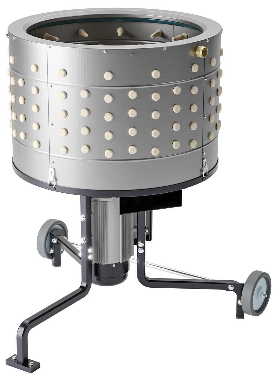 Птица обрабатывается в широком цилиндрическом барабане, оснащенном вращающимся диском. На диске и стенках барабана установлены несколько рядов резиновых пальцев (EU PROFI Birds), которые обеспечивают быстрое и эффективное удаление перьев.