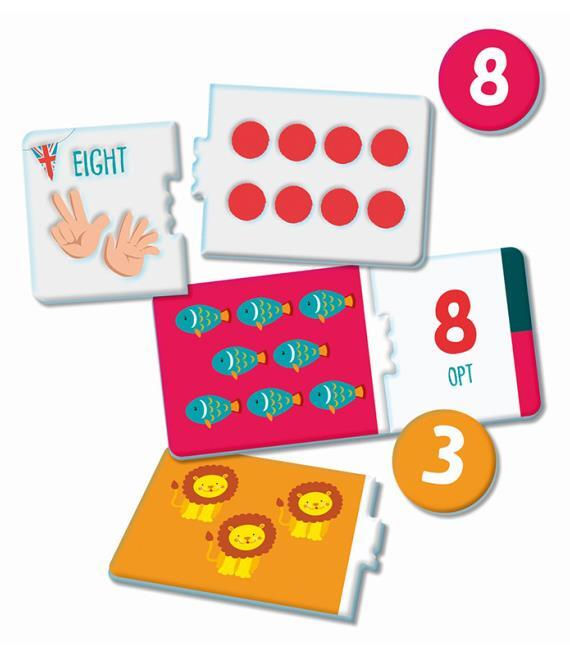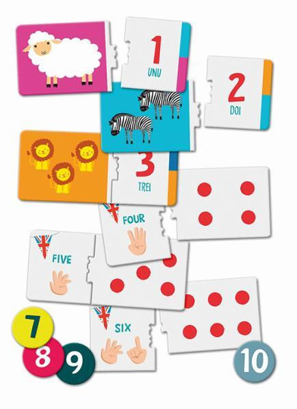 - Componența setului 10 piese de puzzle cu numere, 10 piese de puzzle cu animale și cantități, 10 jetoane cu numere, 1 manual de instrucțiuni
