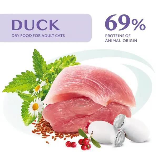 Ingrediente: Proteină de rață deshidratată (min. 26%), orez, porumb, gluten de porumb, grăsime de pui, rață dezosată (5%), celuloză naturală, proteine animale hidrolizate (3,5%), ficat de pui hidrolizat și deshidratat, minerale, semințe de in (1,74%), pulpă de sfeclă, drojdie de bere, ulei de somon (1%), pudră de ou, merișoare (0,2%), ulei de borago (0,1%), beta-1,3/1,6-glucani (0,05%), Actigen® (sursă de prebiotic - mananoligozaharide) (0,04%), gălbenele (sursă de luteină) (0,04%), rădăcină de brusture, rădăcină de bezea, flori de mușețel (0,03%), urzică (0,03%), cimbru 0,015%. Compoziție analitică: proteină brută – 34%, grăsime brută – 16%, cenușă brută – 7,5%, fibră brută – 5,5%, umiditate – 6,5%, calciu – 1,15%, fosfor – 0,95%, magneziu – 0,075%. La 1 kg de furaj: acizi grași Omega-3 – 5,4 g, acizi grași Omega-6 – 28,2 g. 68,9% proteină animală.