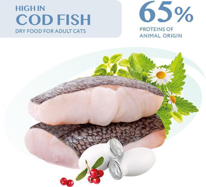 Conținutul ridicat de cod oferă pisicilor proteine de înaltă calitate, ușor digerabile. Colagenul nedenaturat și acizii grași omega-3 din peștele întreg promovează o piele sănătoasă și o blană strălucitoare.