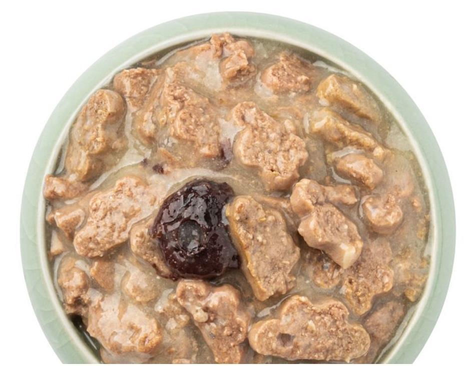 Ingrediente: 80% carne și subproduse animale în bucăți (inclusiv 20% pui, 14% inimă de vită etc.), subproduse vegetale (merișor 1%, pulpă de sfeclă, fibre, cheag (sursă de luteină) 0,01%, rădăcină de brusture, rădăcină de bezea, flori de mușețel 0,01%, urzică 0,01%, cimbru 0,01%), extracte de proteine vegetale, minerale, cereale, uleiuri și grăsimi (ulei de somon, ulei de limbă de miel), zaharuri, MOS (oligozaharide manan prebiotice) 0,01%, beta-1,3/1,6 glucani 0,01%.