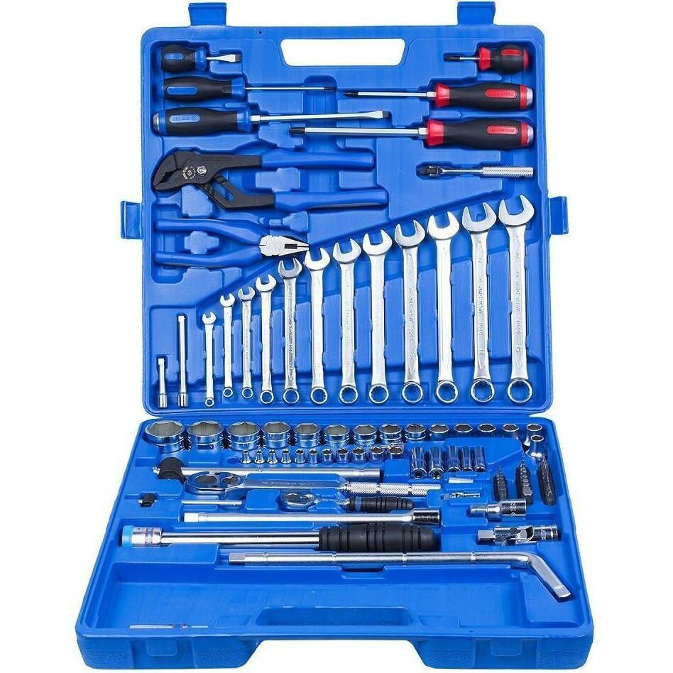 Tip: set de instrumente de mână / Material: oțel CrV / Număr de subiecți, buc.: 109 / Instrument: cheie combinată;cheie inelară;cheie hexagonală;clește tăietor;ciocan;șurubelniță;clește universal;clichet;cheie tubulară