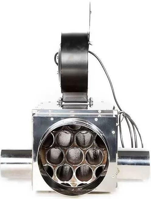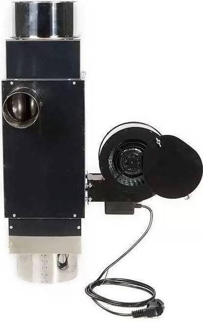 Gazele de ardere fierbinți care ies din dispozitivul de încălzire în coș trec printr-un schimbător de căldură, încălzind simultan aerul curat provenit din încăpere. Un ventilator radial împinge aerul încălzit afară prin două ieșiri de aer cald.