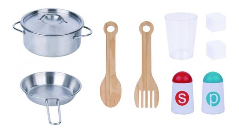 - Componența setului 9 piese: cratiță cu capac / tigaie / 2 spatule / solniță / piperniță / pahar / 2 cuburi de gheață