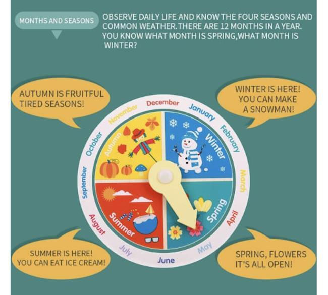 Copiii pot învăța în mod jucăuș conceptele de timp, zile, date, luni, vreme și anotimpuri prin mișcarea cursoarelor de pe tabla de joc.