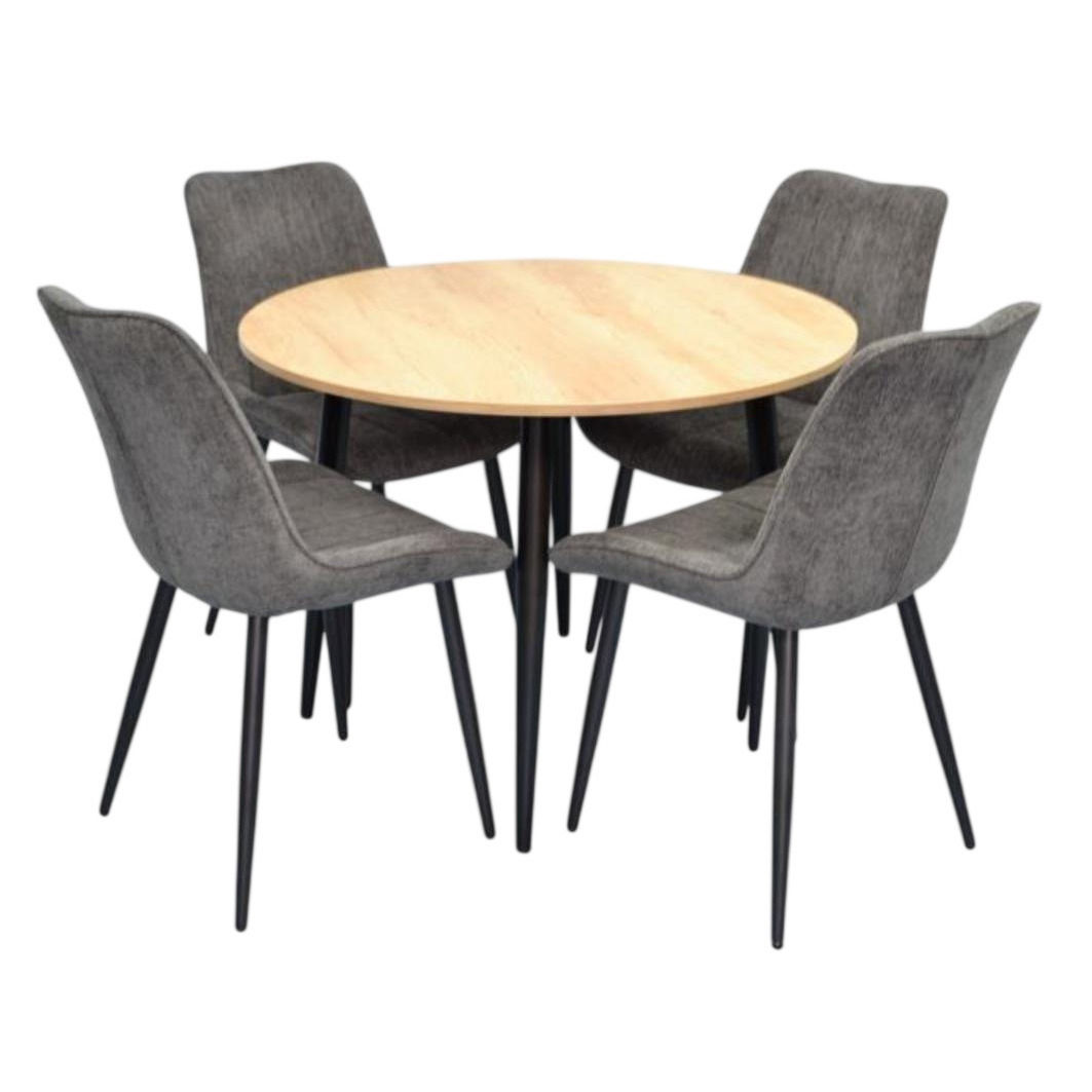 Numărul de scaune: 3 / Forma mesei: rotundă / Material masă: PAL / Materialul scaunelor: metal / velur
