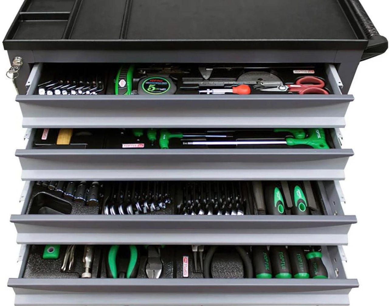 Tip: cutie cu roți / Material: oțel / Mâner pentru transportare: da / Opțiuni: 7 sertare