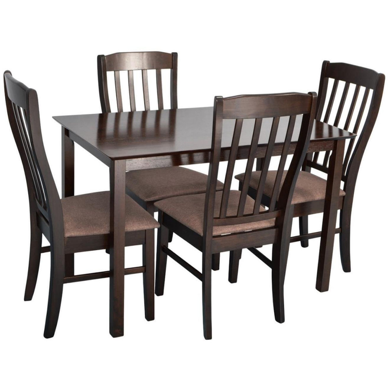 Numărul de scaune: 4 / Forma mesei: dreptunghiular / Material masă: lemn / Materialul scaunelor: lemn / țesătură