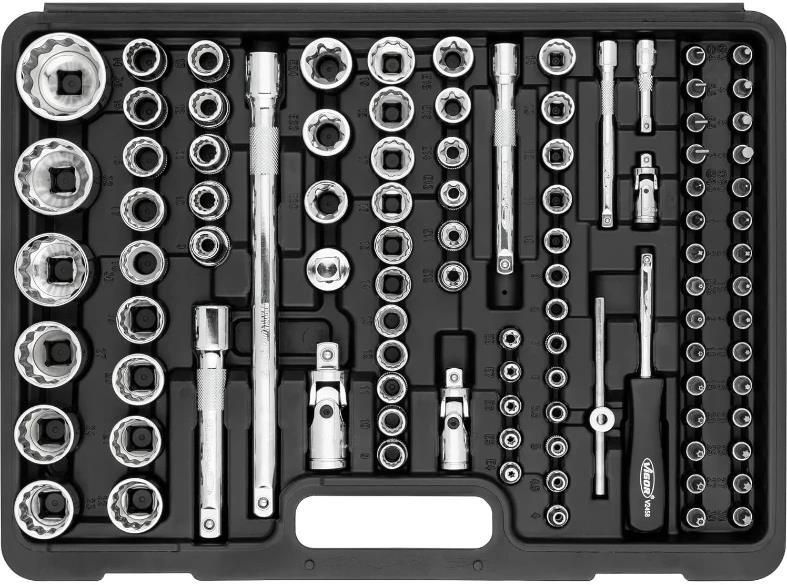 Тип: набор торцевых головок с трещоткой / Материал: сталь CrV / Количество предметов, шт.: 126 / Инструмент: ключ торцевой;трещотка