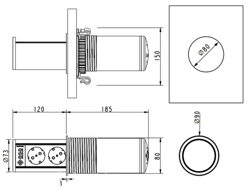 - Model 060.47F.00115 Versalift round version 2 sockets F + 1 USB 5V (A+C) + wireless Black methacrylate