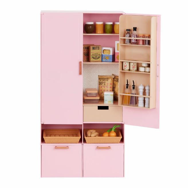 Dimensiuni: aproximativ 46 cm (înălțime) x 23 cm (lungime) x 11,5 cm (lățime). Ușile cămării se închid cu clic pentru o asamblare rapidă și ușoară. Compatibil cu majoritatea păpușilor de 46 cm înălțime, mobilier pentru păpuși și seturi de jucării pentru bucătărie. Păpușile se vând separat.