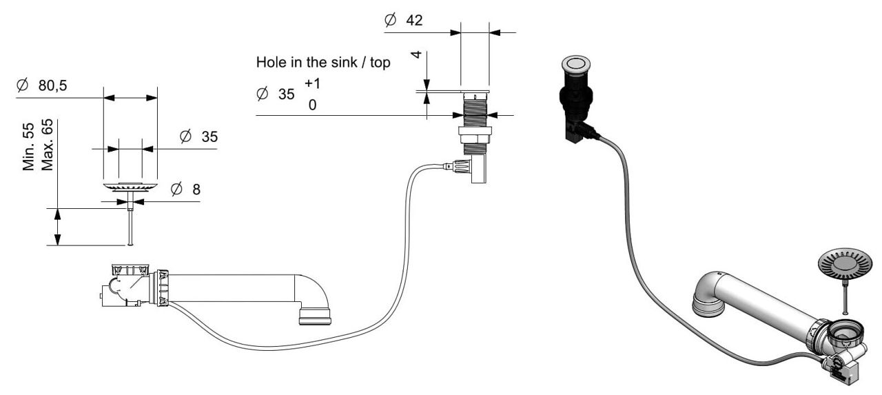 Тип: донный клапан / Тип монтажа: встраиваемый / Назначение: для умывальника / Цвет: нержавеющая сталь