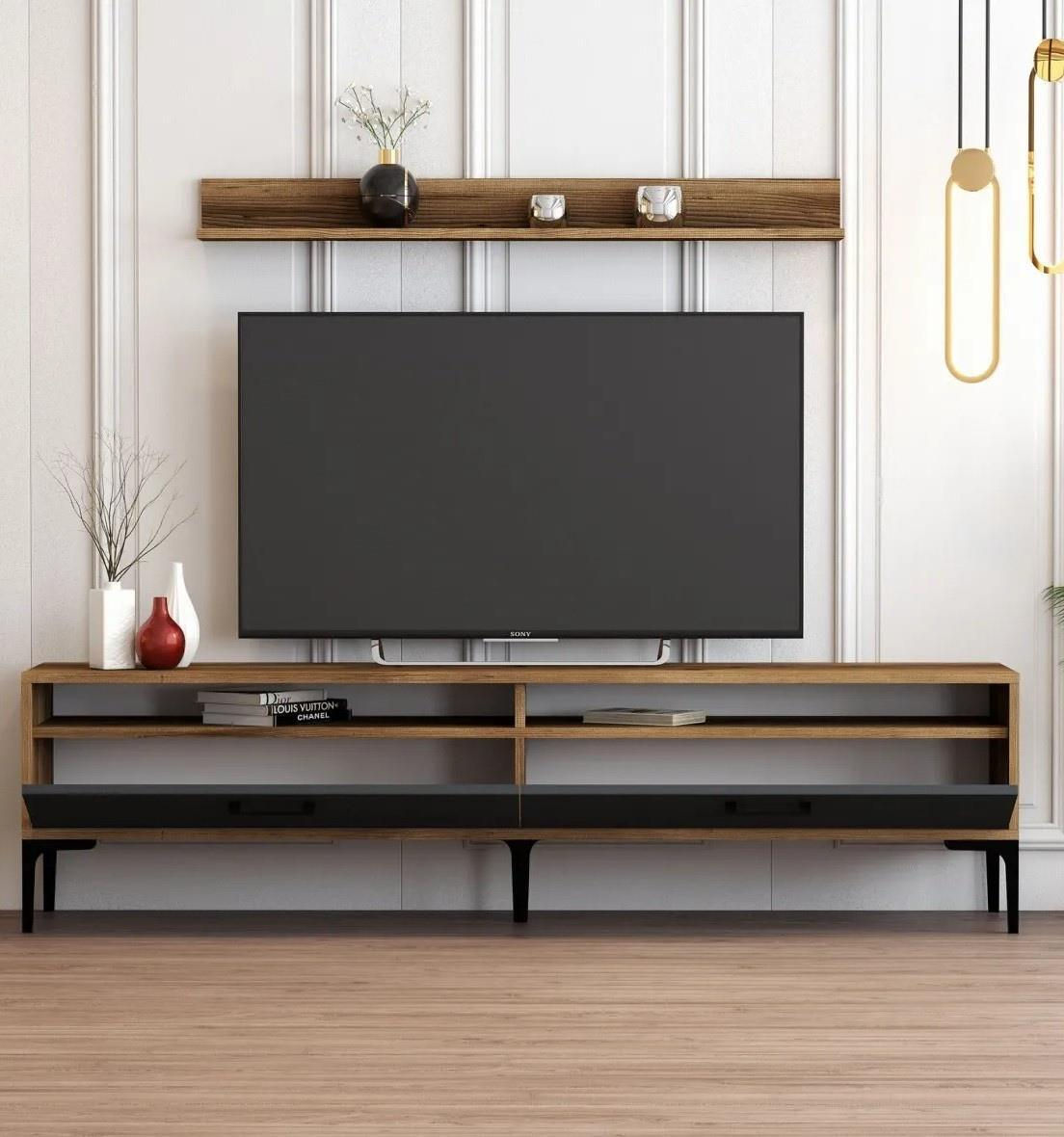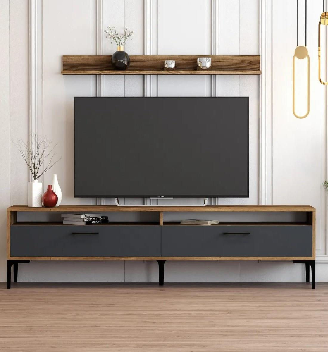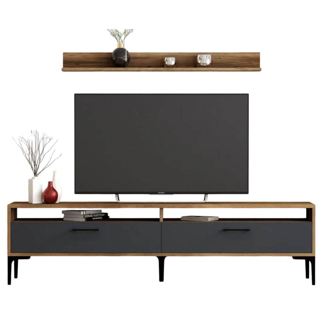 Combinația de culori nuc și antracit conferă unității noastre tv un aspect elegant și sofisticat. Conceptul modern și inedit adaugă o notă de eleganță oricărei camere de zi, în timp ce picioarele metalice de inspirație industrială adaugă o notă unică și la modă.
