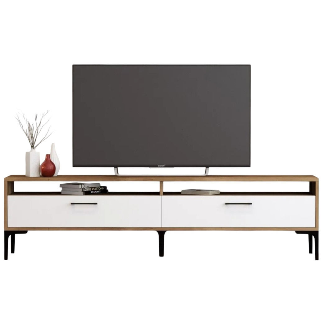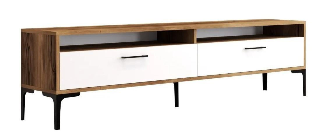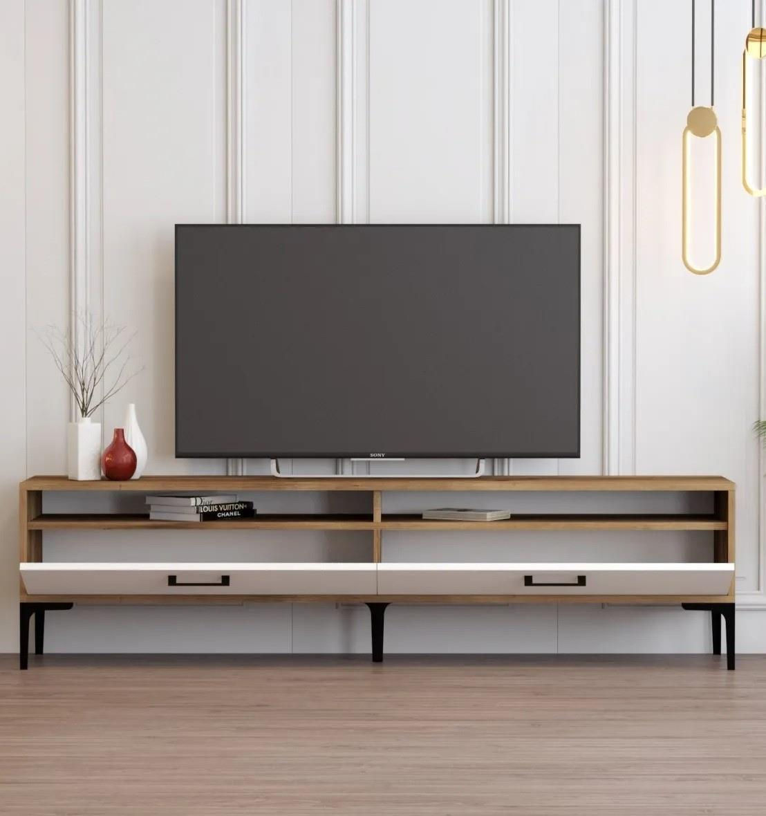Unitatea tv prezintă o combinație captivantă de culori de nuc și alb, creând un contrast vizual atrăgător care va îmbunătăți fără efort estetica spațiului dvs. de locuit. Tonurile calde ale nucului emană eleganță, în timp ce albul clar adaugă o notă de modernitate, ceea ce o face o piesă versatilă care completează orice stil de interior.
