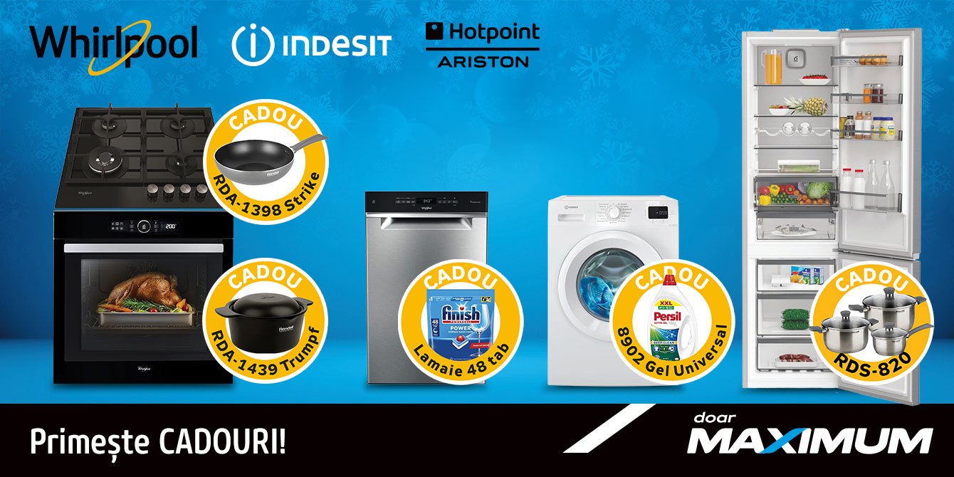 Transformă-ți sărbătorile de iarnă în momente magice: tehnica are grijă de confort și de economisirea timpului, iar cadourile — de bucurie și căldură. Promoția este valabilă până pe 25 ianuarie 2026. Creează atmosfera de sărbătoare pentru tine și cei dragi, alături de Whirlpool, Indesit și Hotpoint-Ariston!