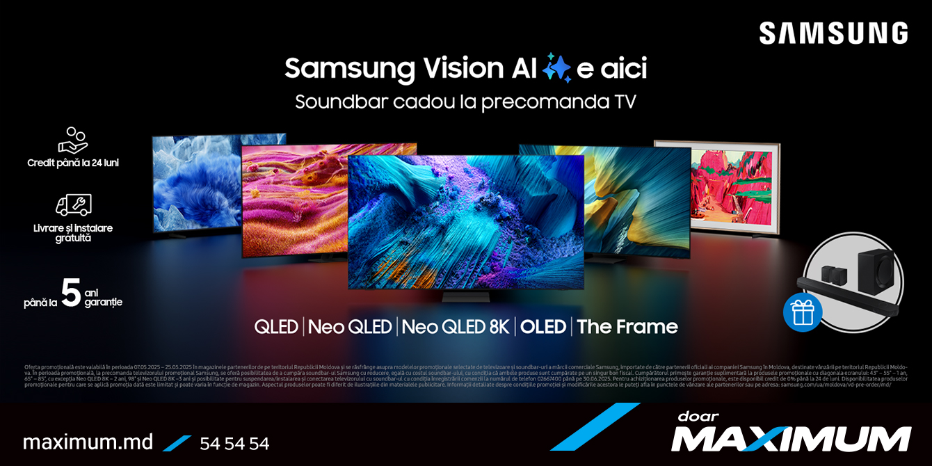 Precomanda noii game de televizoare Samsung -nu este doar o actualizare de tehnică, ci un salt către un nou nivel de experiențe. Precomanda TV până pe 25 mai la Maximum îți oferă și condiții avantajoase: achitare în rate pe o perioadă de până la 24 de luni, garanție extinsă de până la 5 ani, instalare profesională și un soundbar de marcă cadou. La Maximum te așteaptă calitate premium, condiții corecte și bonusuri reale.