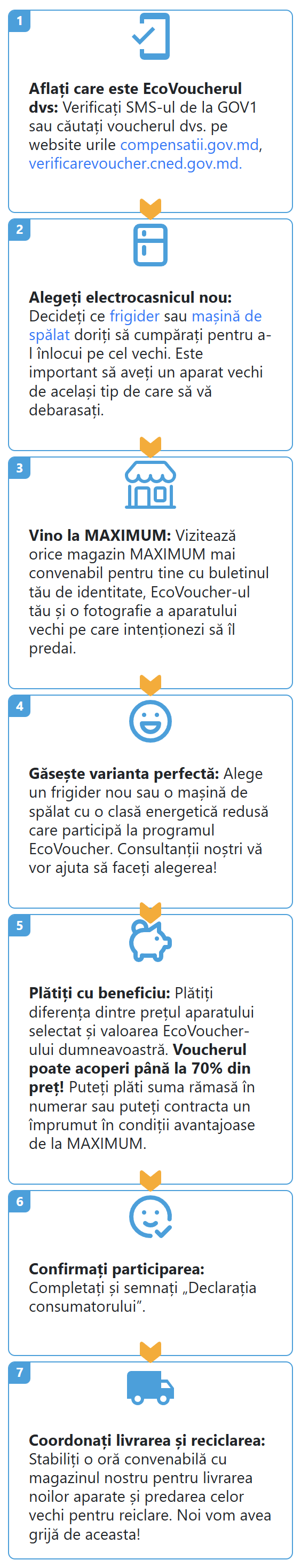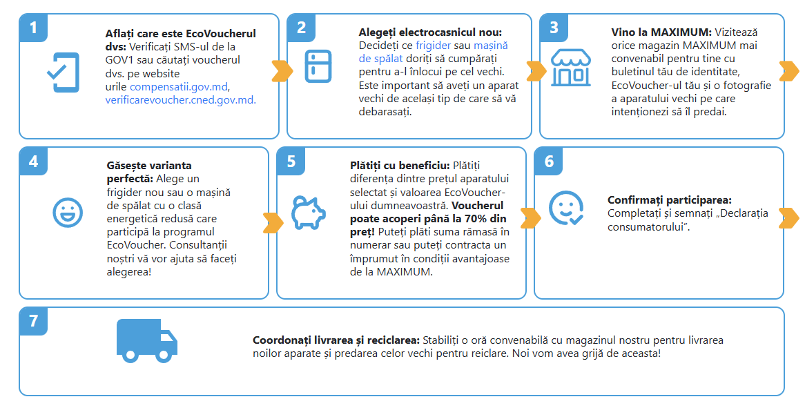 Doriți să vă faceți casa mai eficientă energetic și mai modernă, economisind în același timp bani? Cu programul EcoVoucher de la guvern și MAXIMUM, este și mai ușor! Urmați acești pași simpli pentru a vă schimba voucherul pentru un frigider sau o mașină de spălat noi, cu o clasă de consum energetic redus: