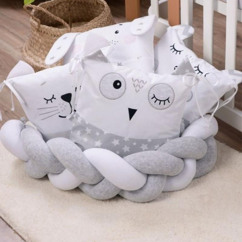 - Бортик-коса - стильная, мягкая, приятная на ощупь защита, не ограничивает доступ воздуха в кроватку, не занимает много места. Может быть использована для декора детской комнаты или игр. До рождения малыша можно использовать как удобную подушку для беременной.