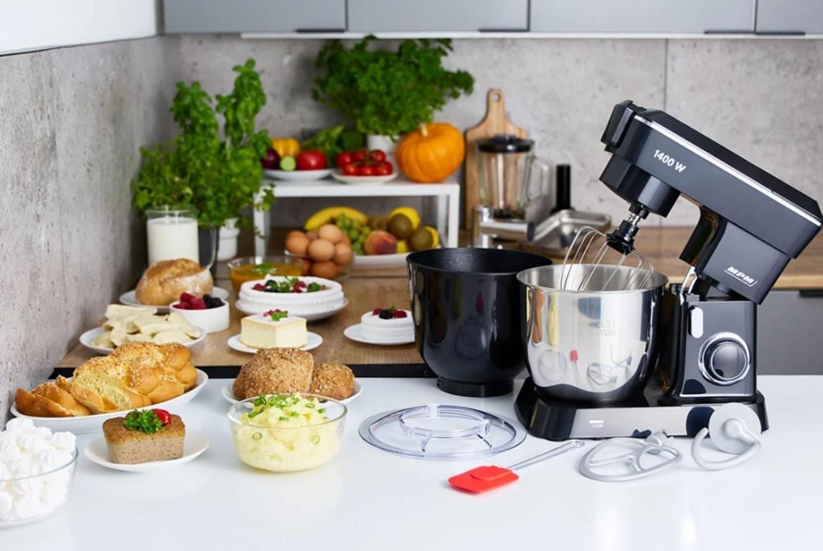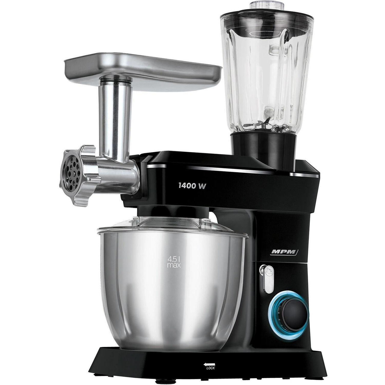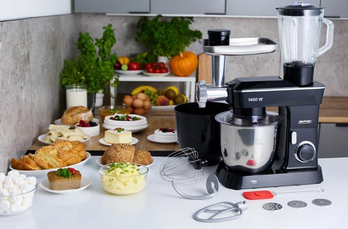 Макс. потребляемая мощность, Вт: 1400 / Тип управления: механический / Количество скоростей: 10 / Аксессуары в комплекте: насадка "блендер";насадка "мясорубка";насадка для взбивания;насадка для смешивания;насадка для теста