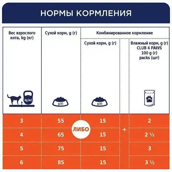 Рекомендации по кормлению: Корм необходимо вводить в рацион постепенно (по крайней мере, в течение первых 5 дней). Обеспечьте питомцу постоянный доступ к чистой свежей питьевой воде. Индивидуальные нормы кормления могут изменяться в зависимости от возраста, породы, уровня активности и среды обитания животного. Комбинируйте кормление с влажными кормами CLUB 4 PAWS для взрослых кошек. Дата изготовления, дата «использовать до», номер партии, номер регистрационного удостоверения указаны на упаковке.