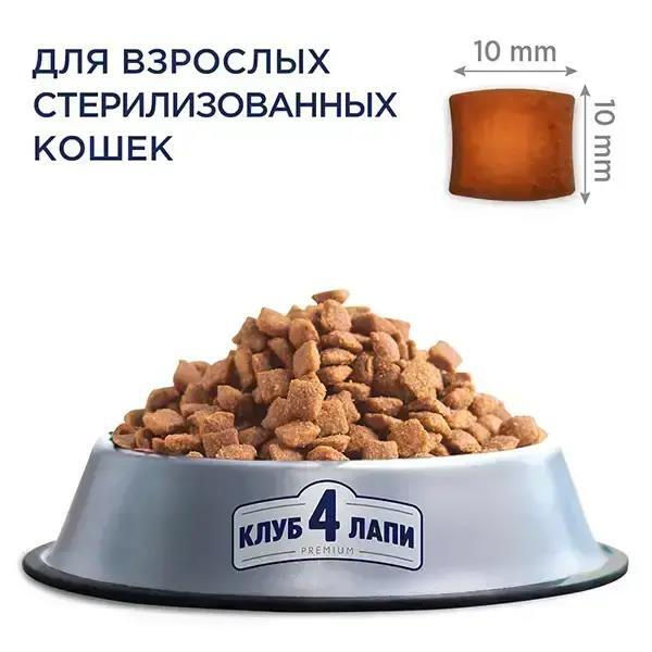Рекомендации по кормлению: корм вводить в рацион постепенно (в течение первых 5 дней). Обеспечьте постоянный доступ к чистой свежей питьевой воде. Индивидуальные нормы кормления могут изменяться в зависимости от возраста, породы, уровня активности и среды обитания. Комбинируйте с консервированным кормом CLUB 4 PAWS Премиум «Стерилизованные». Полнорационный консервированный корм для взрослых стерилизованных котов.