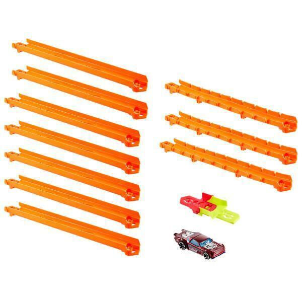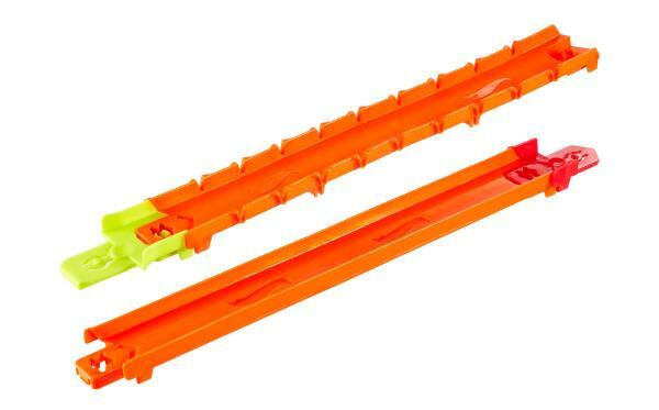 - Комплектация набора 7 прямых жёстких дорожек по 30 см, 3 гибких дорожки по 30 см, 2 адаптера для соединения с классическими треками Hot Wheels (legacy e-track), машинка