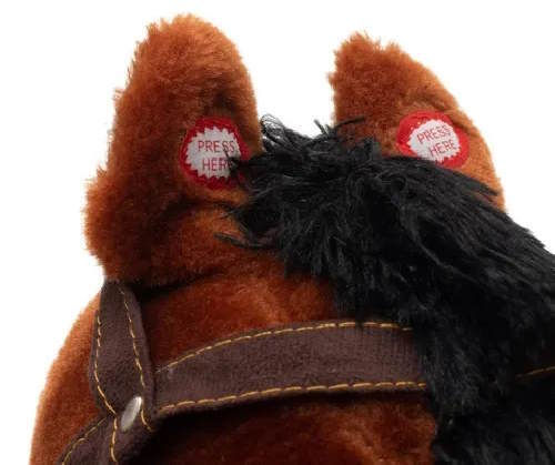- Altele când apeși butoanele de pe urechi, calul dă din coadă, își mișcă laba, se aude un sunet de galop, calul nechează și cântă un cântec de cowboy