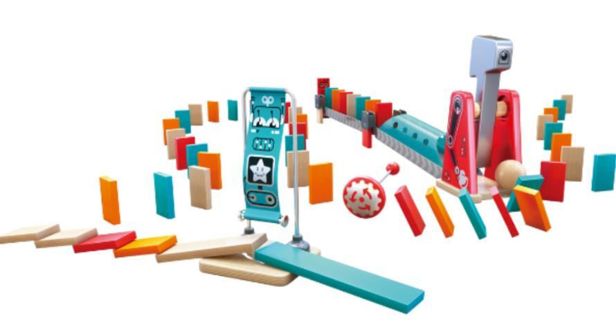 Захватывающий эффект домино: колесо импульса, костяшки и деревянный шарик передают движение до самого конца.