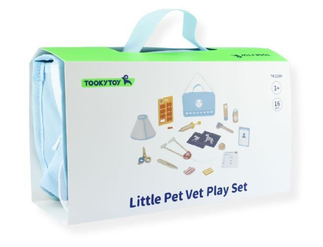 В набор входят деревянные термометр, игла, молоток, стетоскоп и баночки с кремом, а также картонные рентгеновские снимки, блокнот для рецептов, карта пациента, таблица дозировок, пластиковые ножницы и тканевый конус. Все это красиво упаковано в симпатичную тканевую сумку, так что ваш маленький ветеринар сможет путешествовать где угодно, леча драгоценных питомцев.