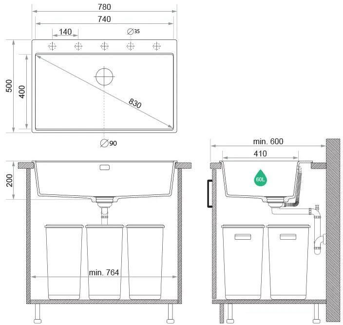 Мойка кухонная Primagran Oslo 80 Top Black metallic + accesorii 530x780 MOMKM