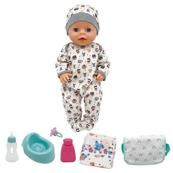 Пупсик в стильном сером костюмчике с принтом животных;