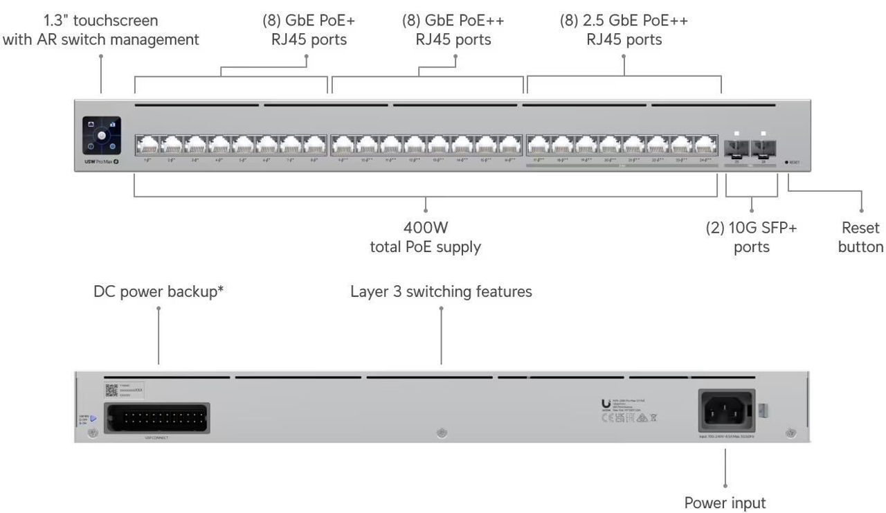 WAN: 10/100/1000 BASE-TX Ethernet / Максимальная скорость LAN портов, Мбит/с: 1000 / Количество LAN портов, шт.: 16 / Наличие РоЕ: да
