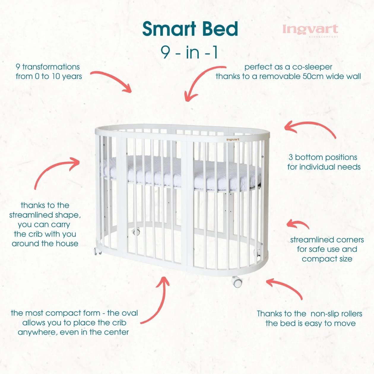 Pătuț Ingvart 1727012 9in1 Smart Bed Rotund Gri (transformabil), 72x72x120cm