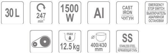 Макс. потребляемая мощность, Вт: 1500 / Материал корпуса: нержавеющая сталь / Материал чаши: металл (нержавеющая сталь) / Объем чаши, л: 20