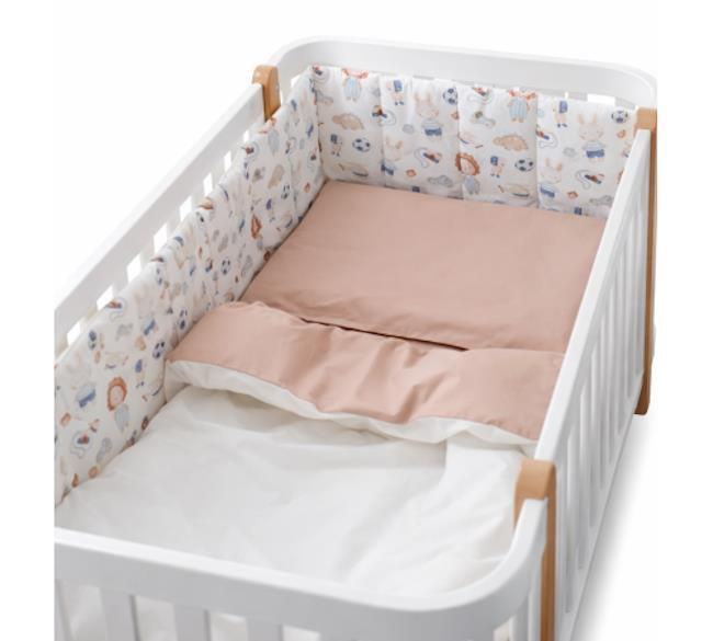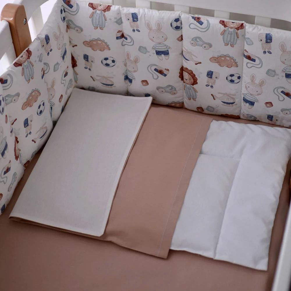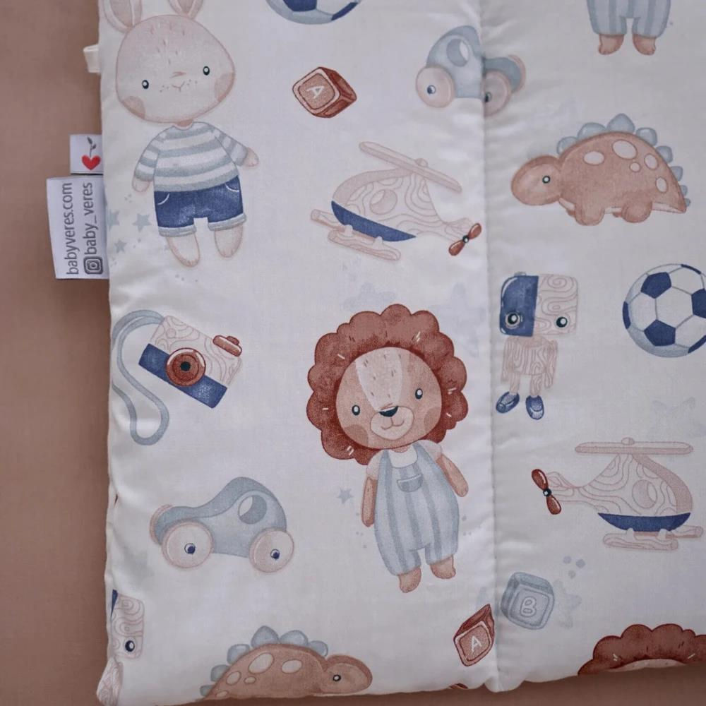 Представьте, как ваш малыш засыпает в окружении добрых друзей. Озорные львята в комбинезонах, милые зайчики, футбольные мячи и вертолетики — этот принт создан для маленьких исследователей, чья фантазия не знает границ. Комплект выполнен в мягких, естественных тонах, которые успокаивают после активного дня и дарят ощущение полной безопасности.