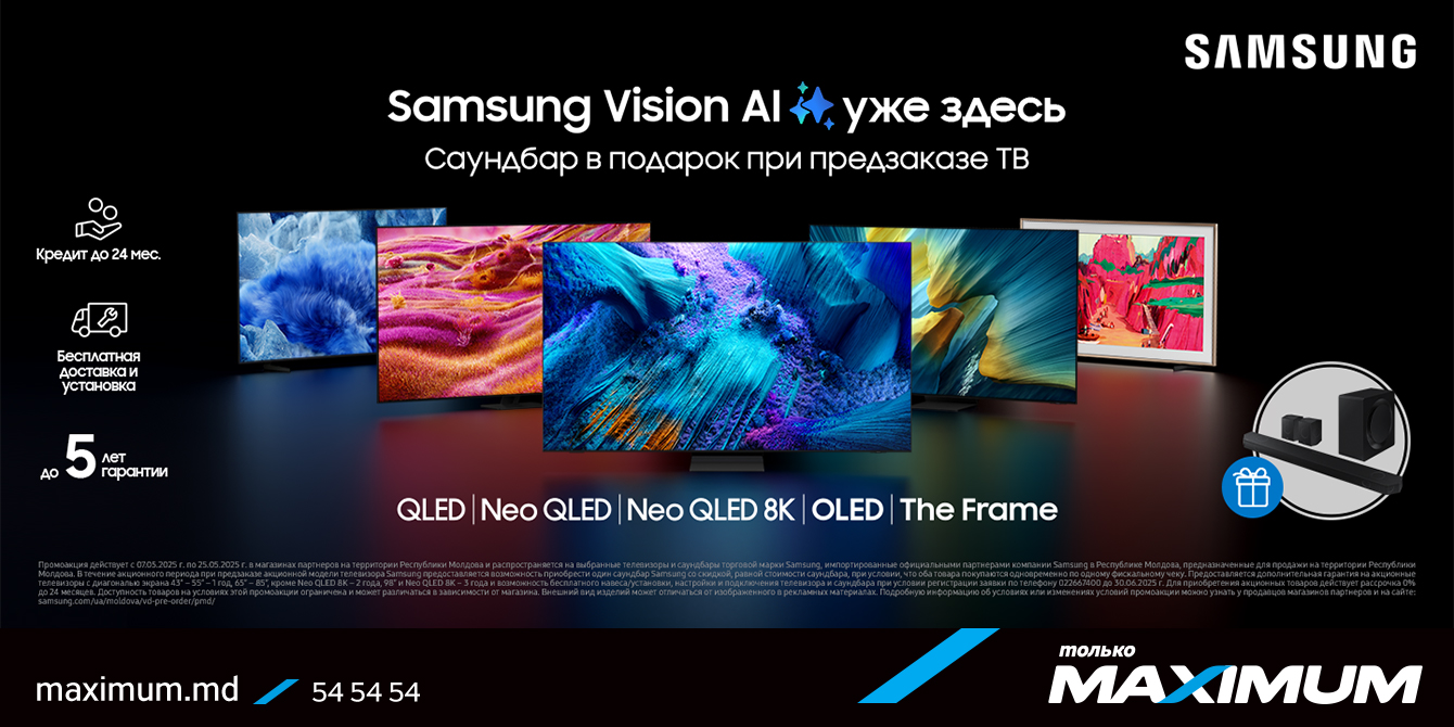 Покупатели моделей, участвующих в предзаказе, получают бесплатную доставку и установку. При регистрации заявки по номеру горячей линии Samsung 022 667 400 можно заказать навес телевизора, его настройку, а также подключение и настройку саундбара. Все услуги выполняются авторизованным сервисным центром Samsung в Молдове.
