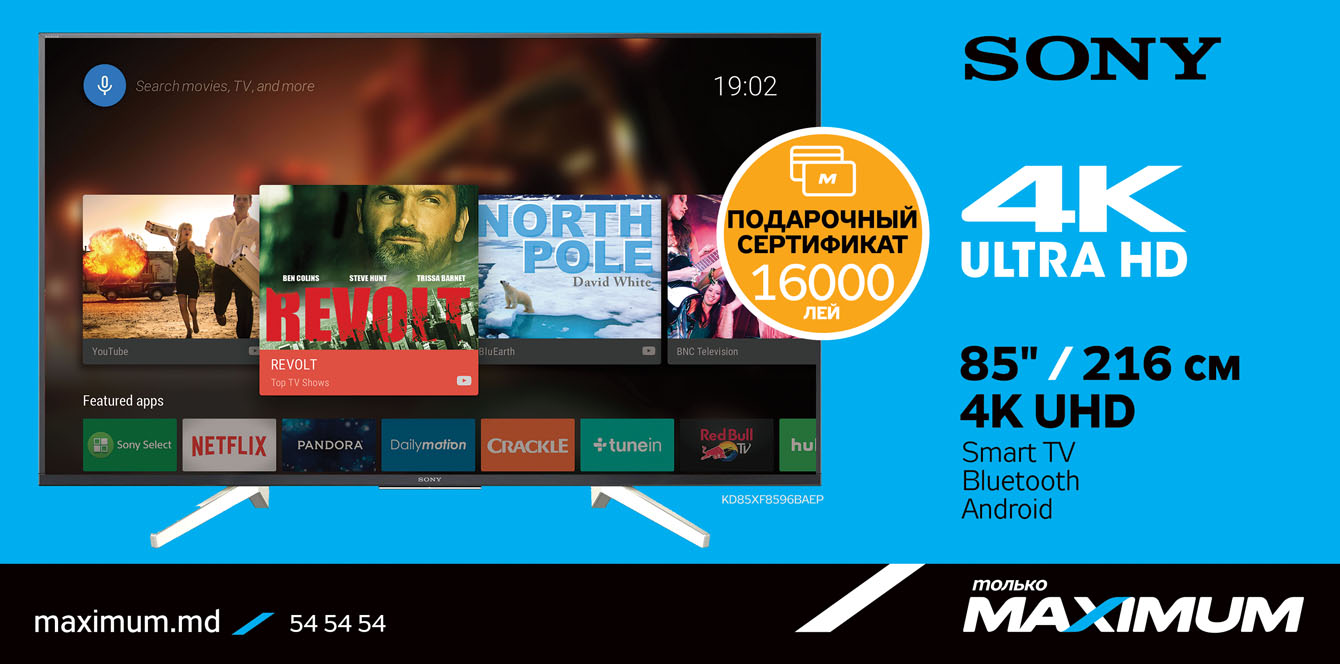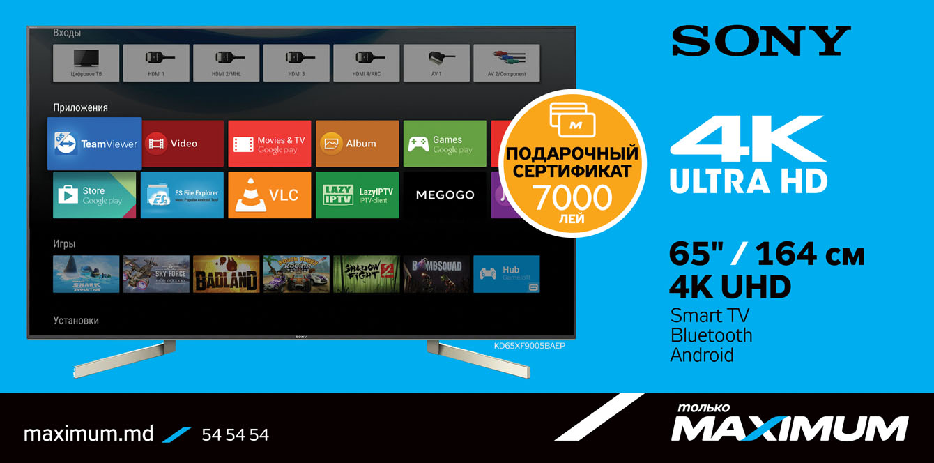 Перейди на новый уровень просмотра любимых фильмов и передач с LED телевизорами Sony 4K 2018 года. Роскошный телевизор станет твоим самым запоминающимся приобретением. А в подарок MAXIMUM вручит тебе денежный сертификат номиналом до 16 000 леев от стоимости покупки!